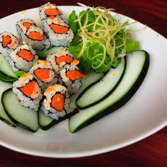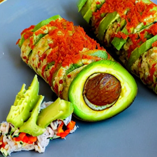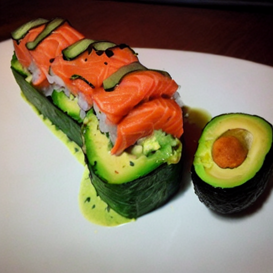 Salmon and avocado on top of spicy tuna roll and cucumber. Special in house sauce.