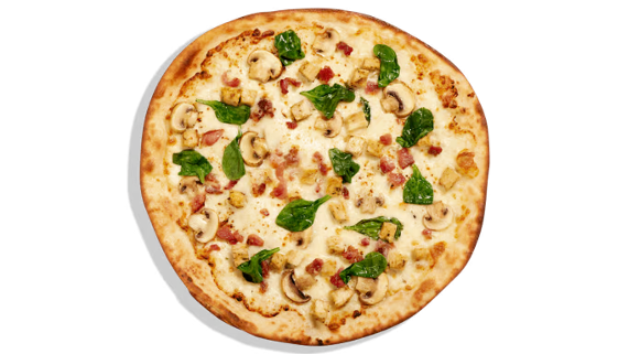Chicken, Bacon, Mushroom, and Spinach on Original Thin Crust, Olive Oil, Alfredo and Mozzarella 190 calories per slice
