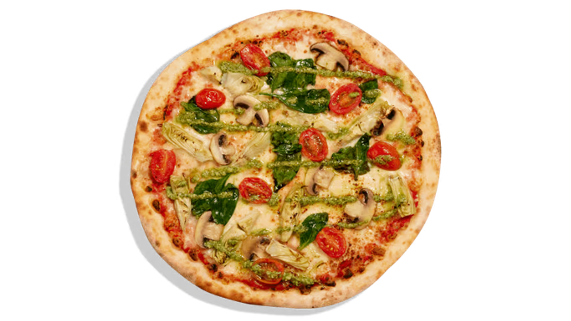 House-Made Red Sauce, Mozzarella, Artichokes, Mushroom, Spinach, Tomatoes. Finished with Pesto.