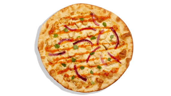 Fiery Buffalo Sauce, Spicy Chicken, Red Onion, Gorgonzola, Mozzarella, Fresh Cilantro & Olive Oil.