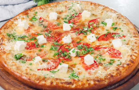 Spanish red sauce with 4 cheeses: Mozzarella, Asiago, Romano, Parmesan cheese.